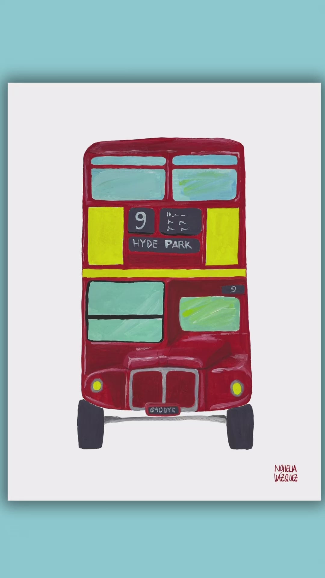 Ilustración hecha con guache de un autobus de dos pisos londonense.